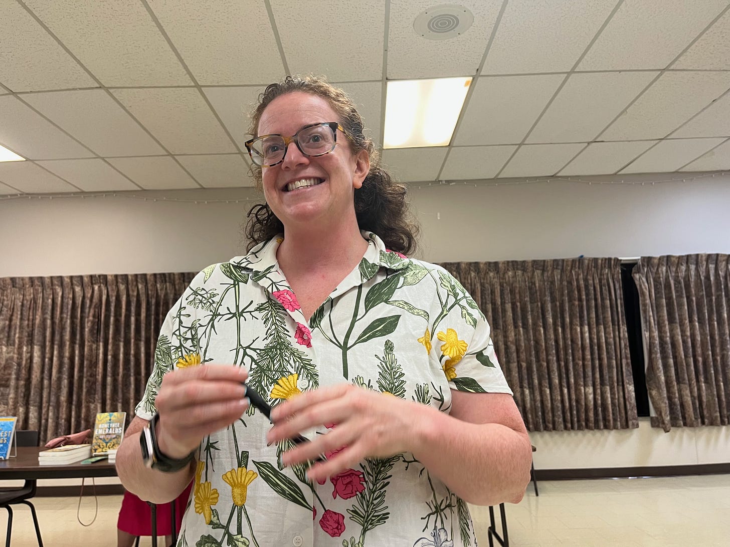 I also had a wonderful night answering that eternal question “Where do you get your ideas” with the smart and fun audience at the Bonnechere Author’s Festival. The photo below is sort of terrifying and makes me look like a malevolent giant trying to pretend to the good folks at Eganville that I’m not about to scoop them up in both hands and stuff them down my maw, but that is NOT what happened. Instead, I ate a lot of butter tarts.